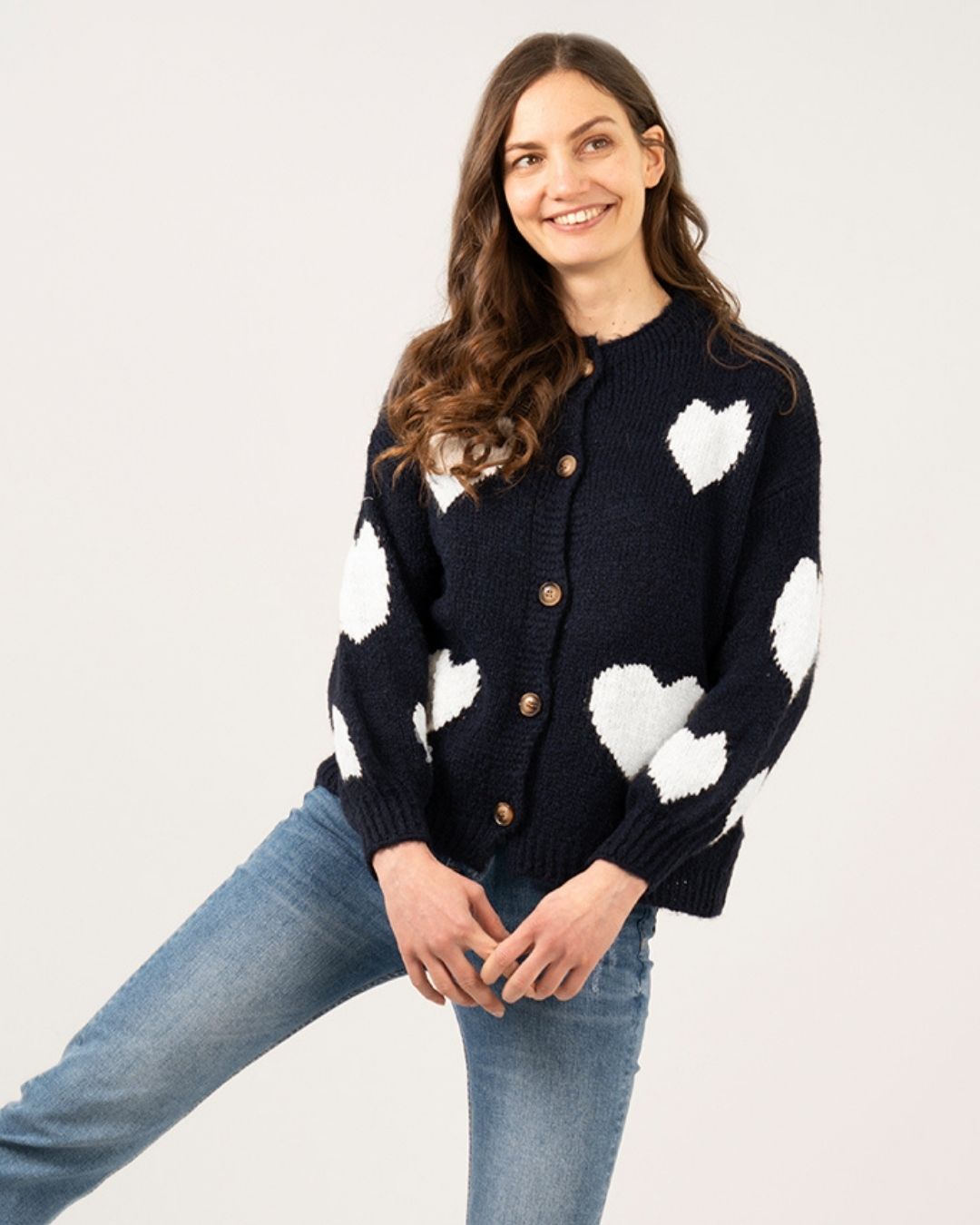 Make a statement in bold heart prints with our Lexi Wool Blend Cardigan. Made from a soft Italian wool blend yarn with, this eye catching piece is the perfect layering style for Spring.