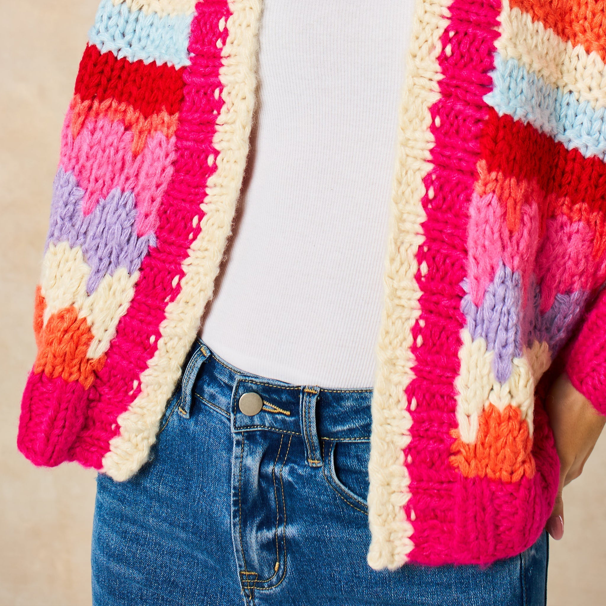 This colourful striped knitted cardigan has been skillfully hand knitted. A relaxed fitting piece with an open front and long balloon sleeves this vibrant piece is designed for comfort.