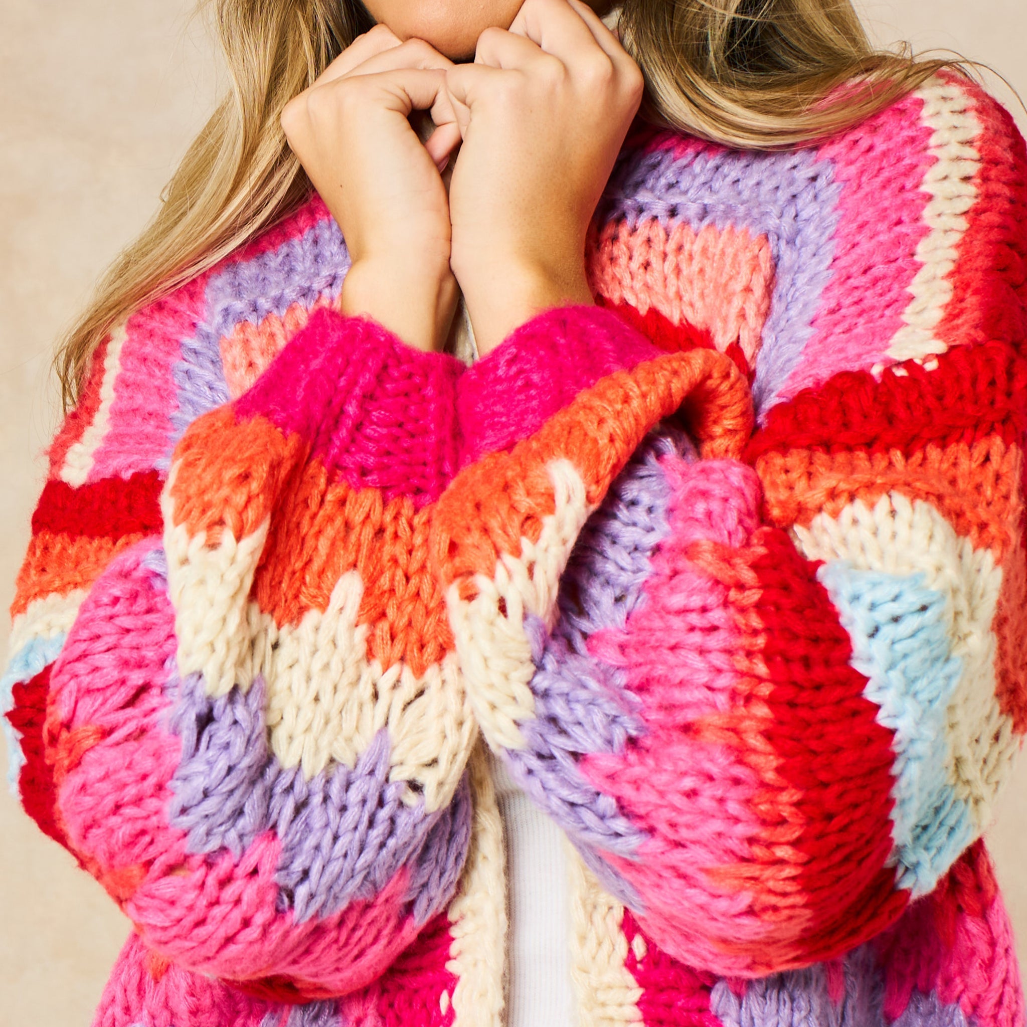 Hand Knitted Rainbow Striped Cardigan in Red/Pink