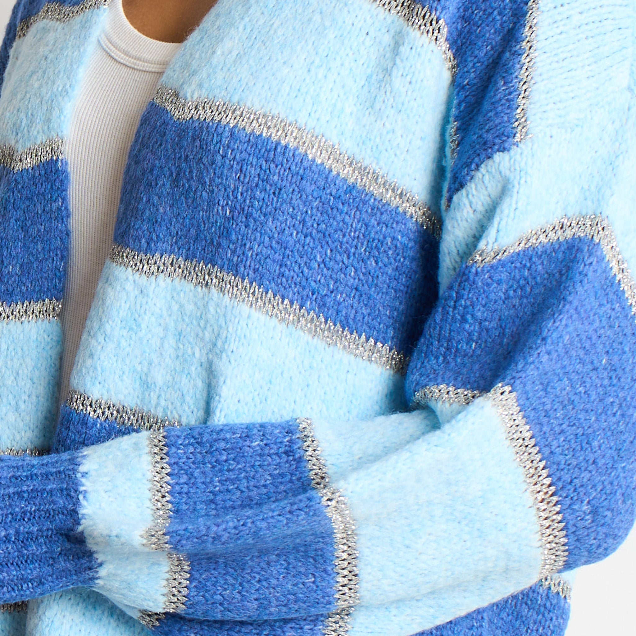 A relaxed fitting open front knitted cardigan crafted from a soft wool blend yarn. Featuring a bold striped design, balloon sleeves and contrasting gold sparkly glitter stripe this piece is ideal for seasonal layering.