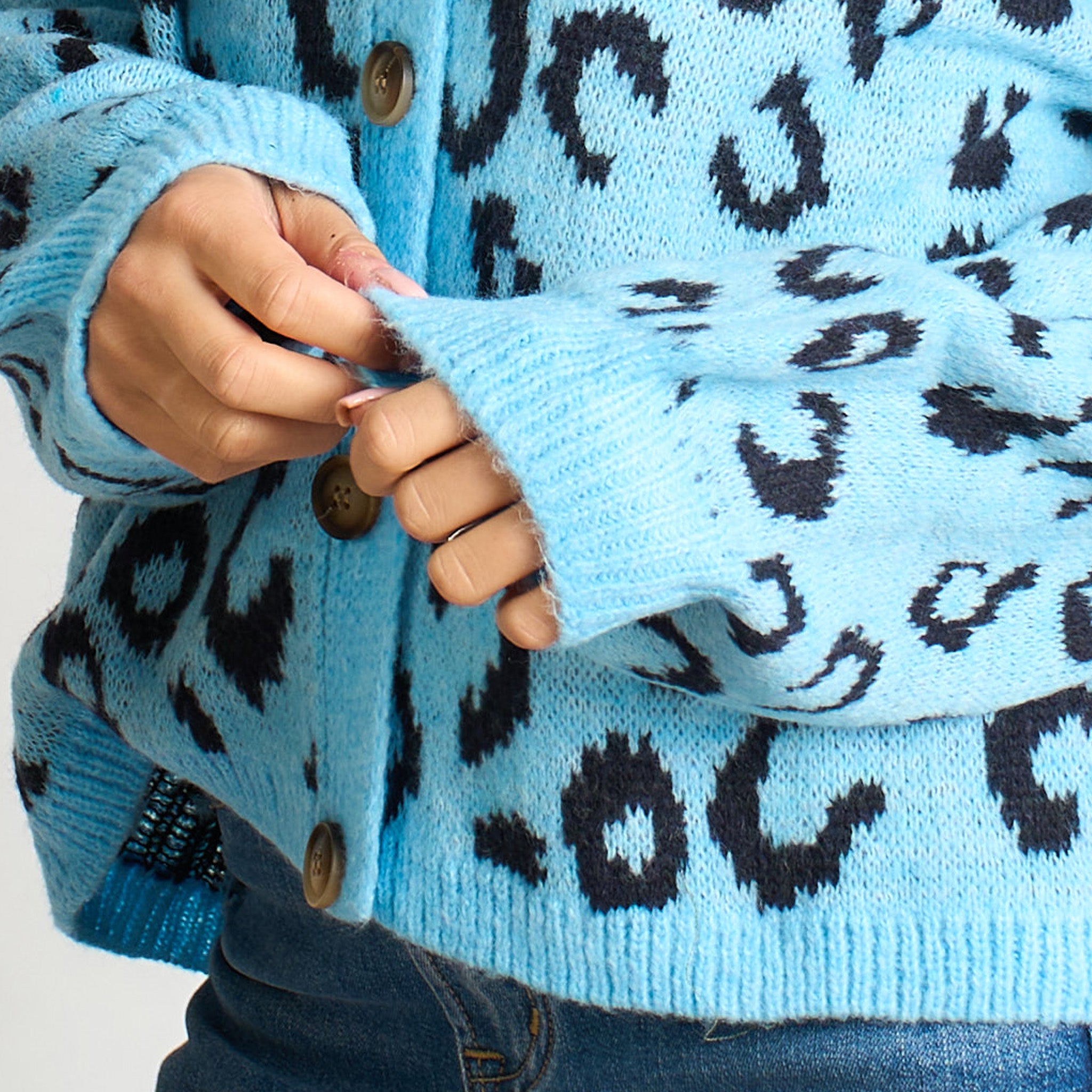 A bold leopard print cardigan crafted from a soft knitted wool blend yarn. Featuring a button front, V-neck and long sleeves this piece is designed for comfort and is ideal for seasonal layering.