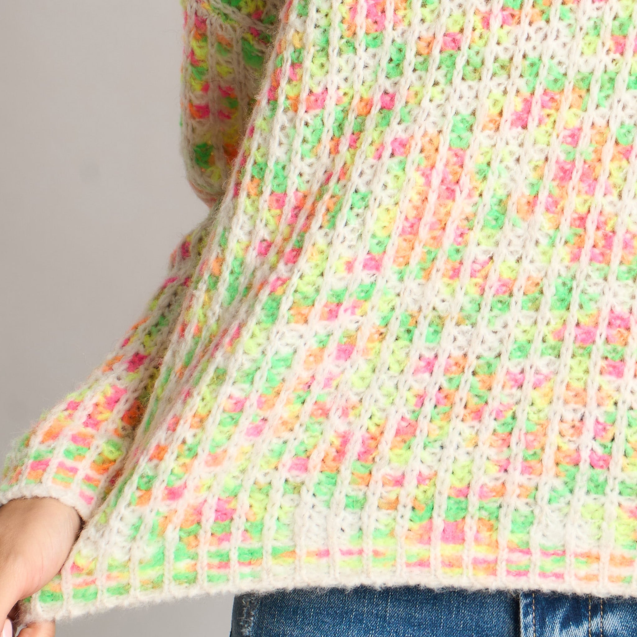 Brighten up your wardrobe with this fun, textured jumper. The soft, Italian wool blend yarn features a blended mix of speckled colours and a contrasting trim, making this knitted jumper is an effortless and contemporary layering piece.
