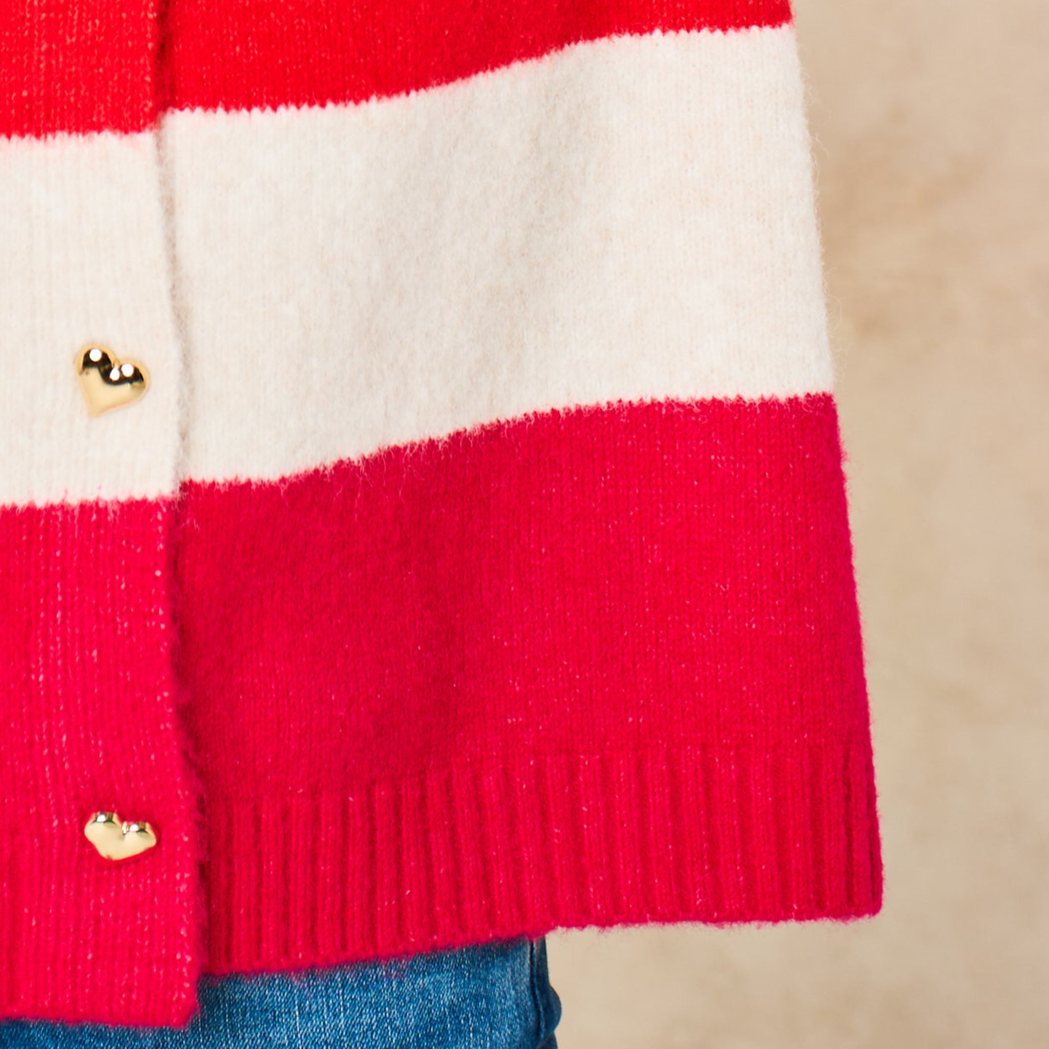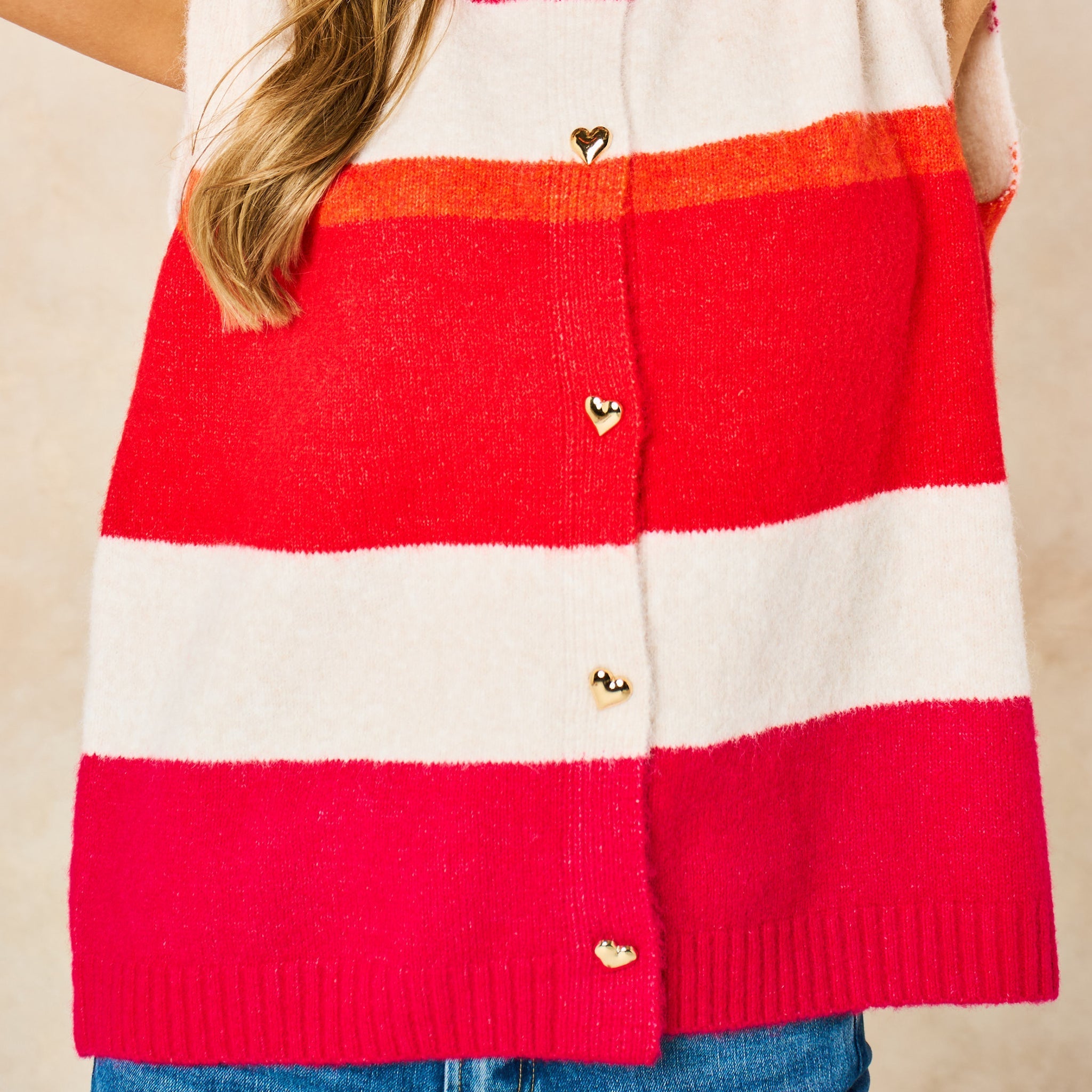 A bold striped sleeveless vest featuring dainty love heart shaped buttons on the front. This knitted design features a classic round neck and is an ideal layering piece.