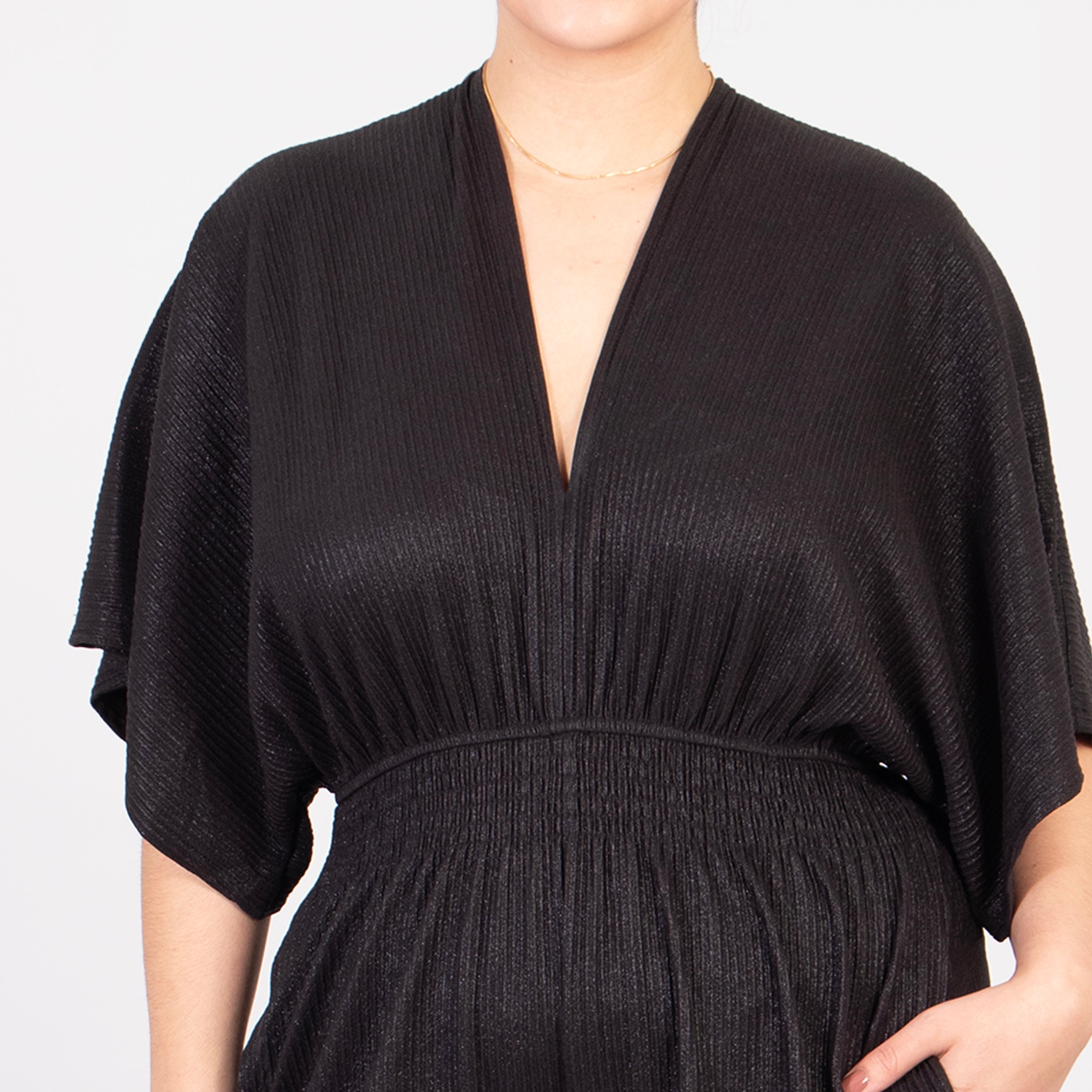 A wide leg jumpsuit crafted from a pleated metallic flowing fabric. Showcasing a flattering deep V-neck, short angel sleeves and a cinched waist. This classic black jumpsuit is an ideal seasonal party piece.