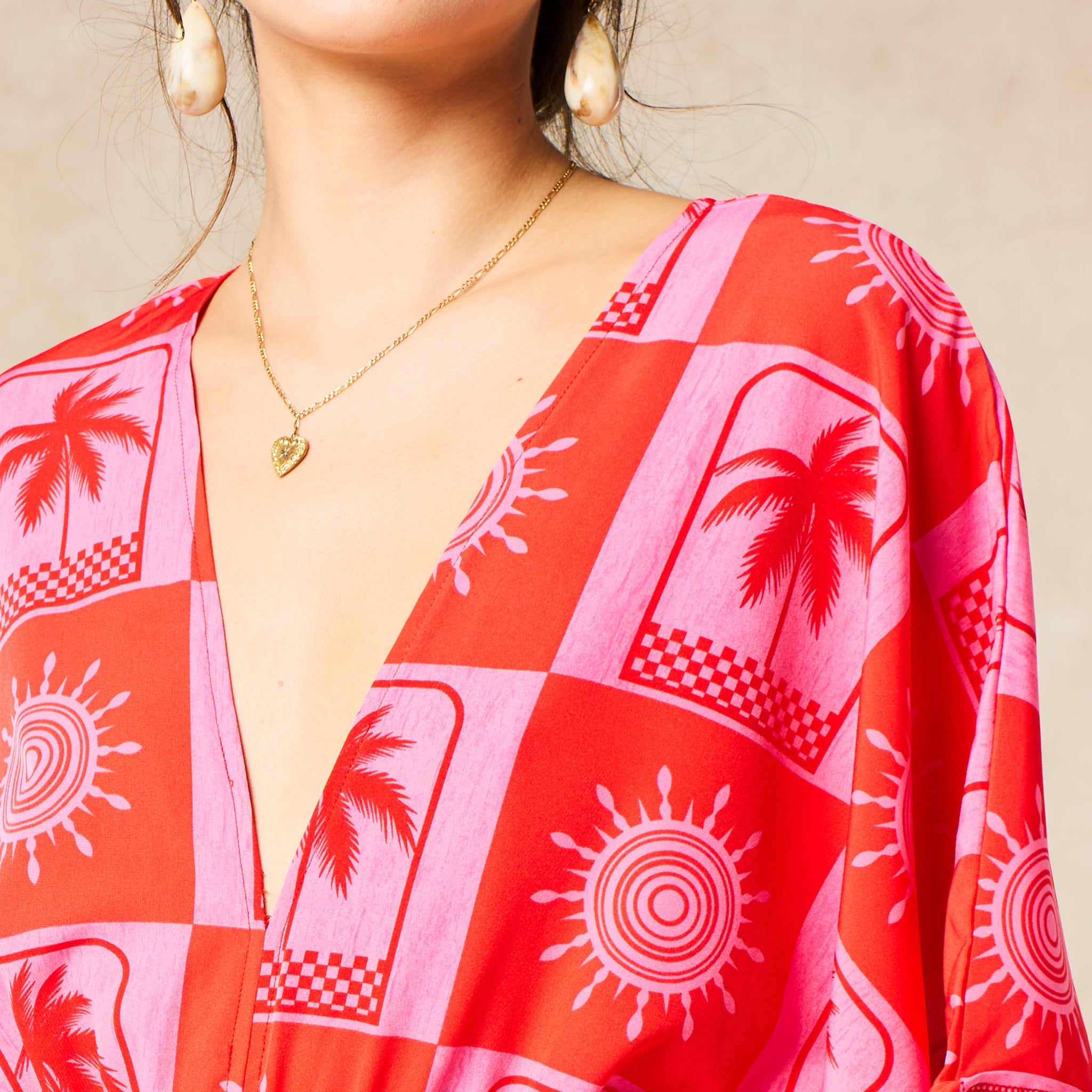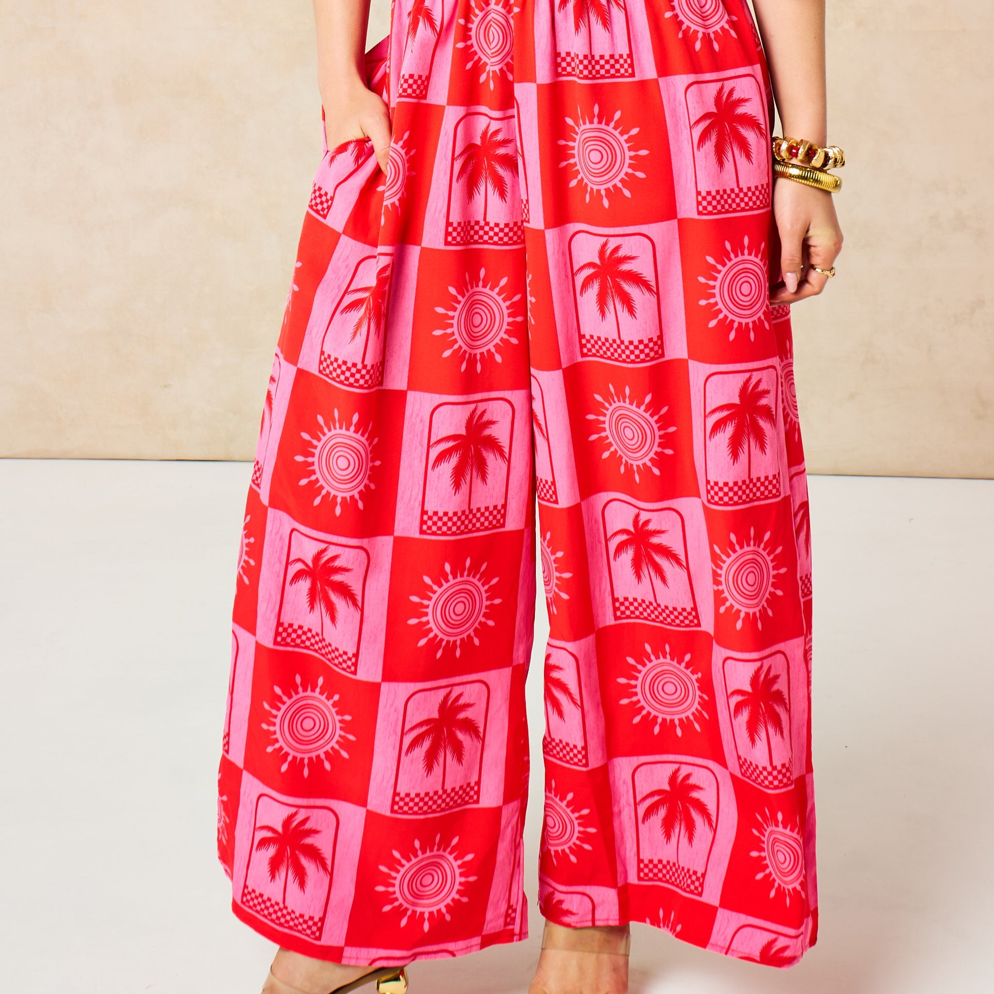 Palm Tree Checkerboard V Neck Jumpsuit in Hot Pink