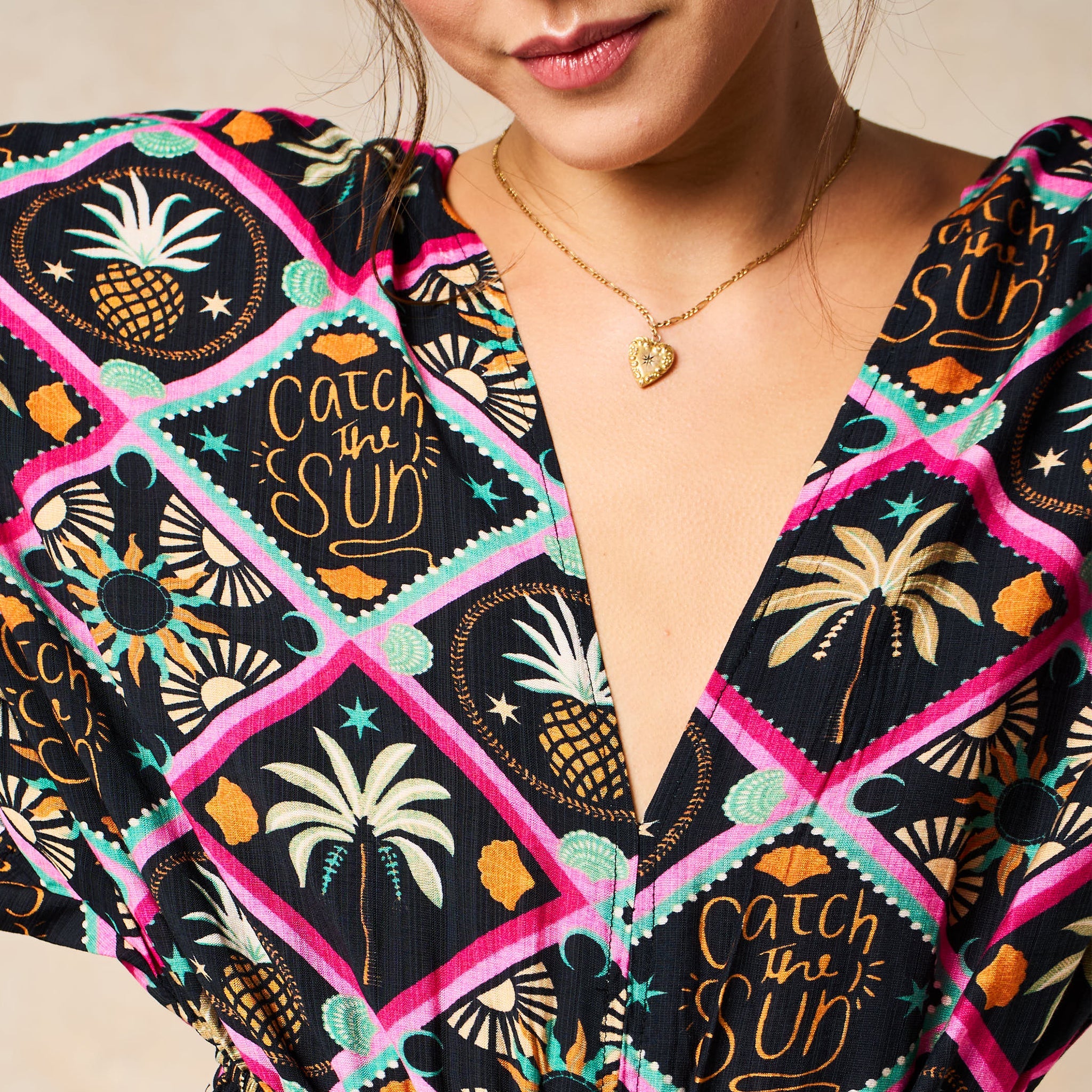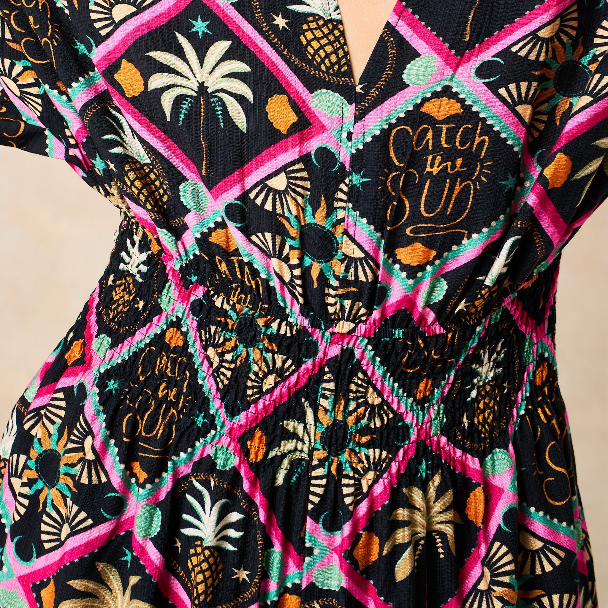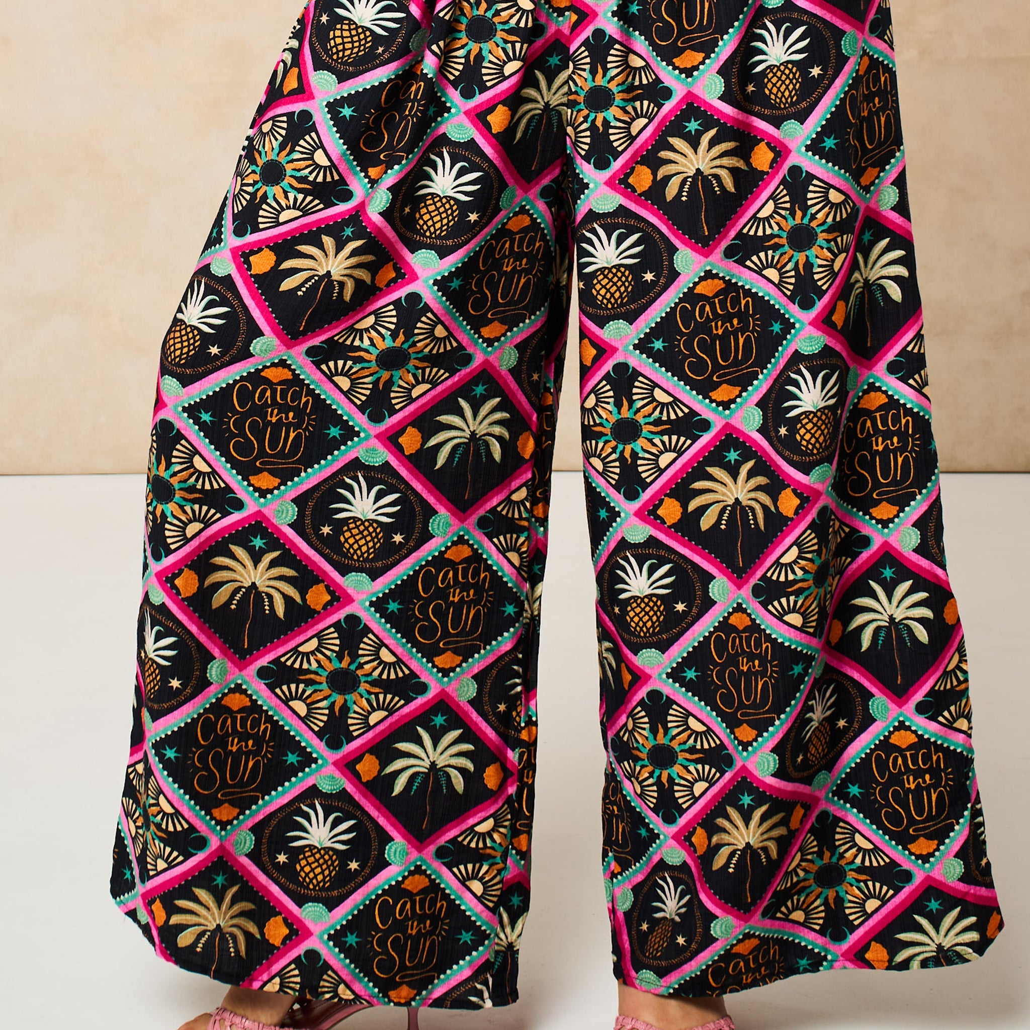 A Summery wide leg jumpsuit crafted from soft blended viscose. Showcasing a bold palm tree checkerboard print, this relaxed fitting outfit is a must have this season. Featuring a deep V-neck, batwing sleeves and a shirred waistline this jumpsuit is designed to create a flattering silhouette.