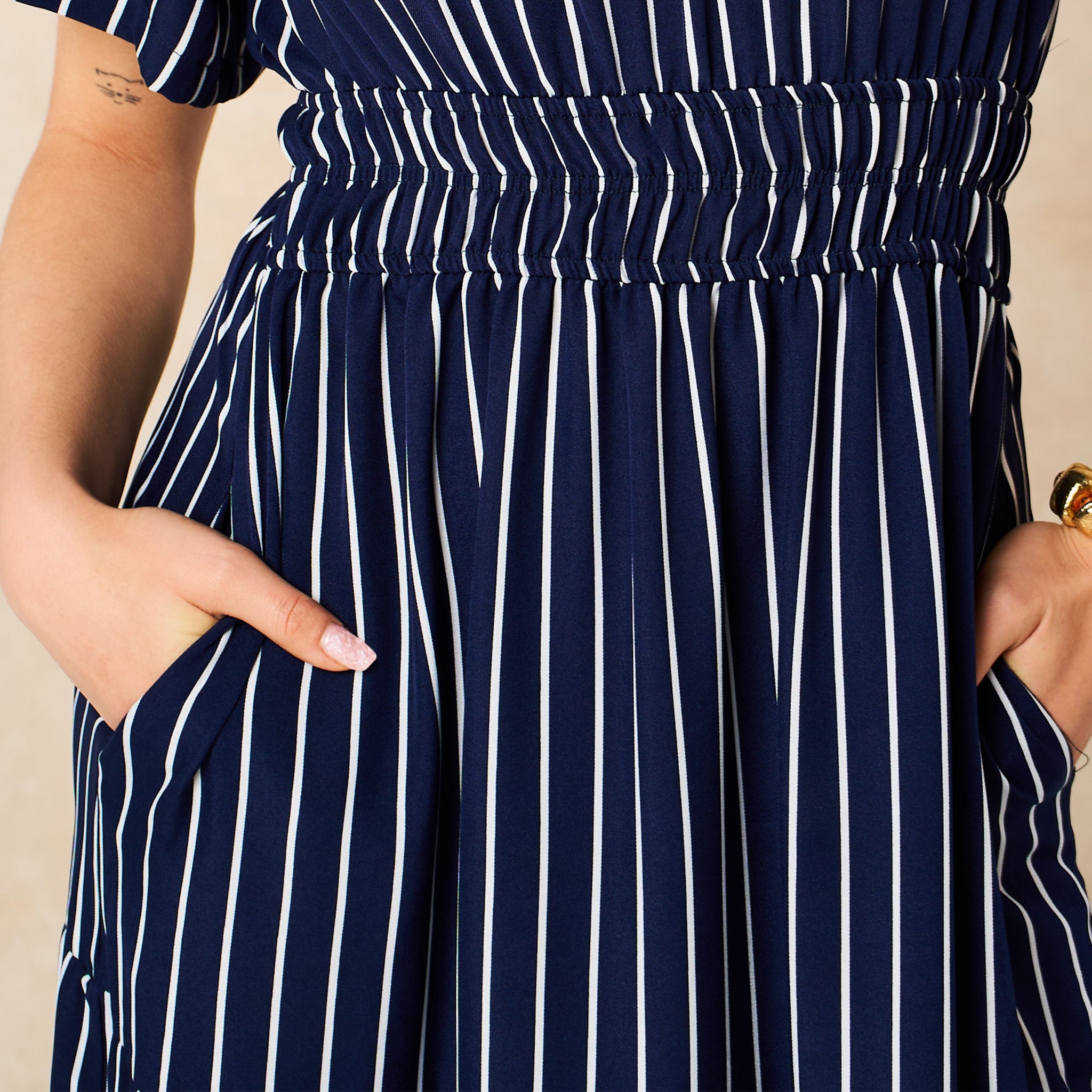 This classic striped tiered maxi dress is a summer essential. Featuring short flutter sleeves, a V-neck and a smocked waist this occasion piece is designed to fit and flatter.