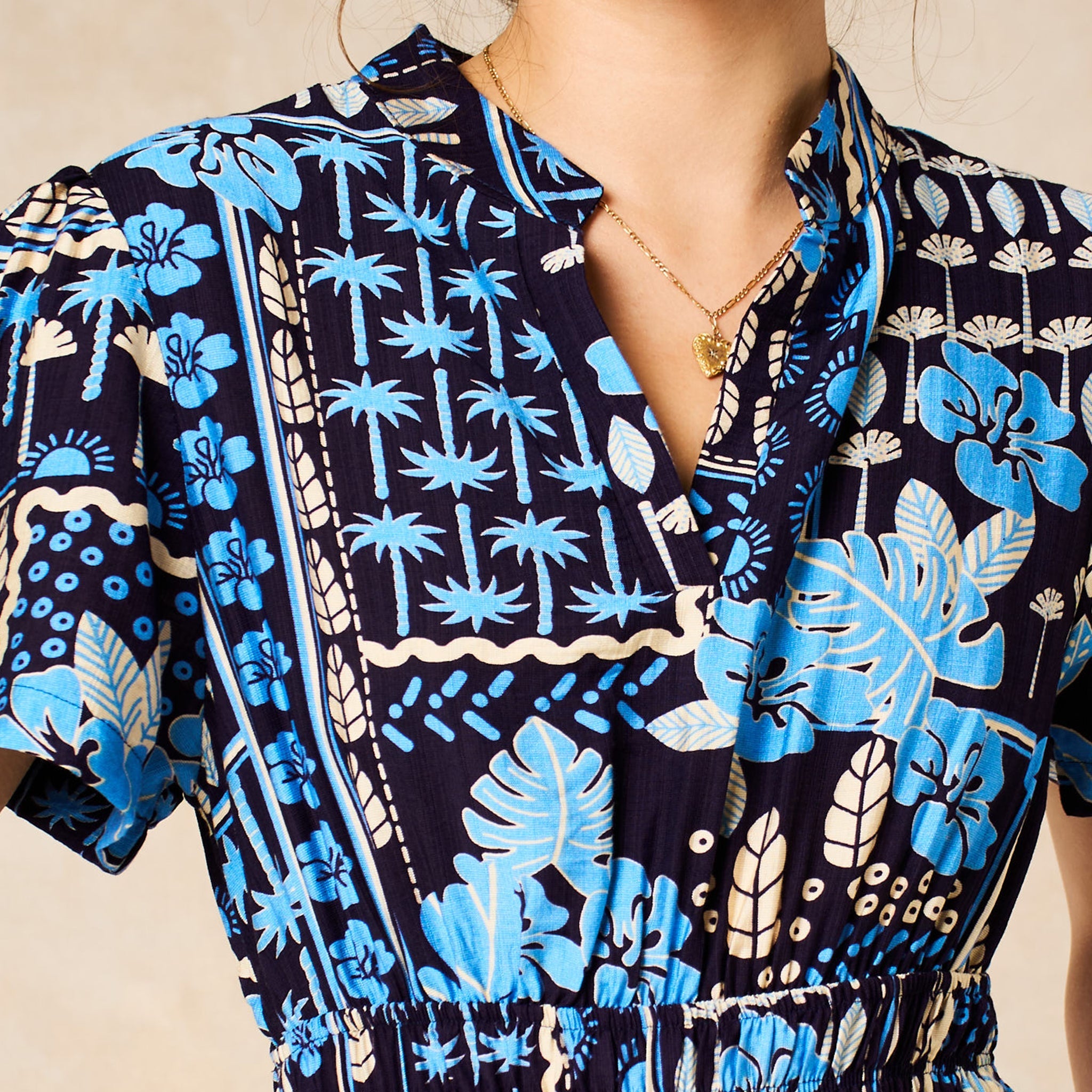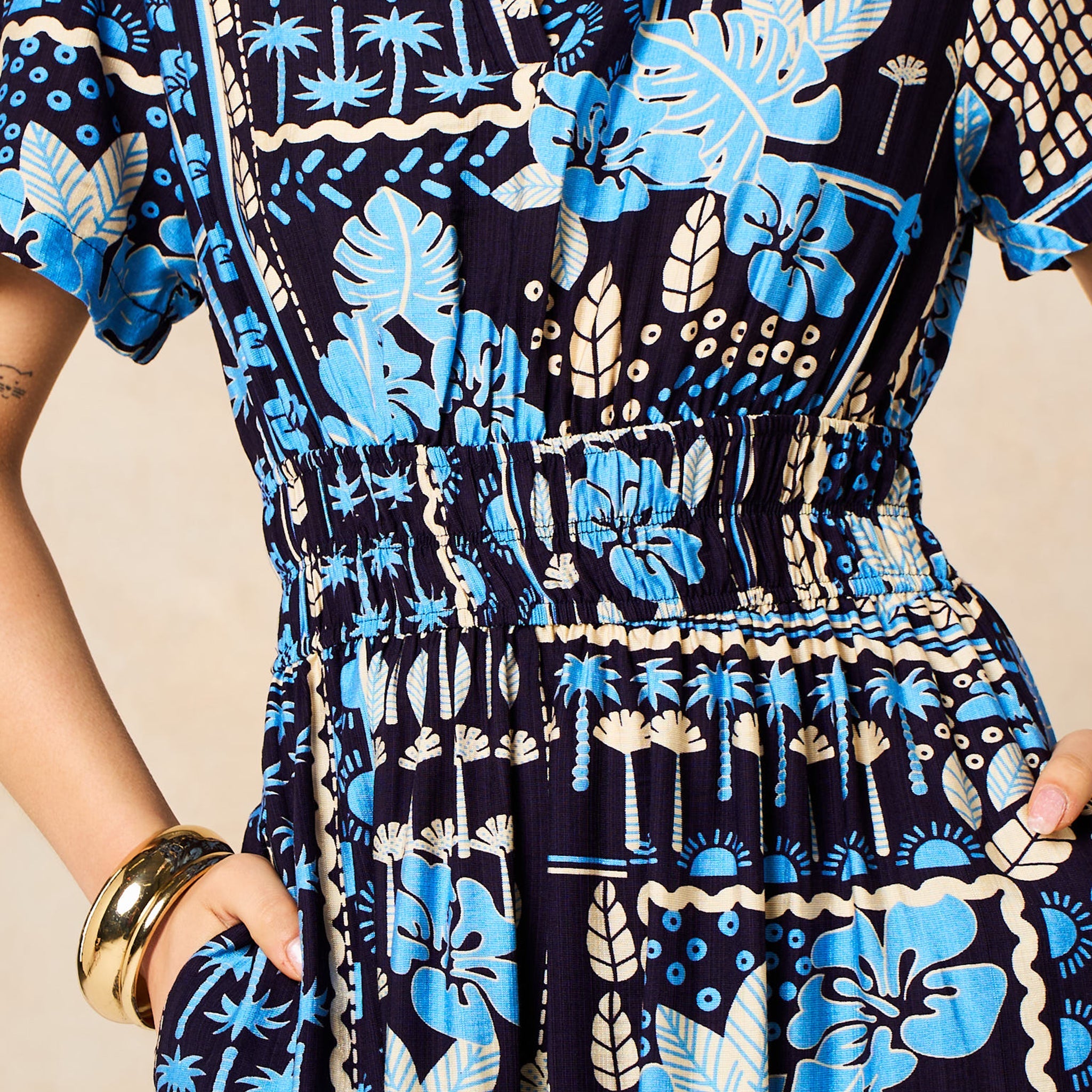 A tiered maxi dress featuring a mixed print tile design, this design is a summer essential. Featuring short flutter sleeves, a V-neck and a smocked waist this occasion piece is designed to fit and flatter.