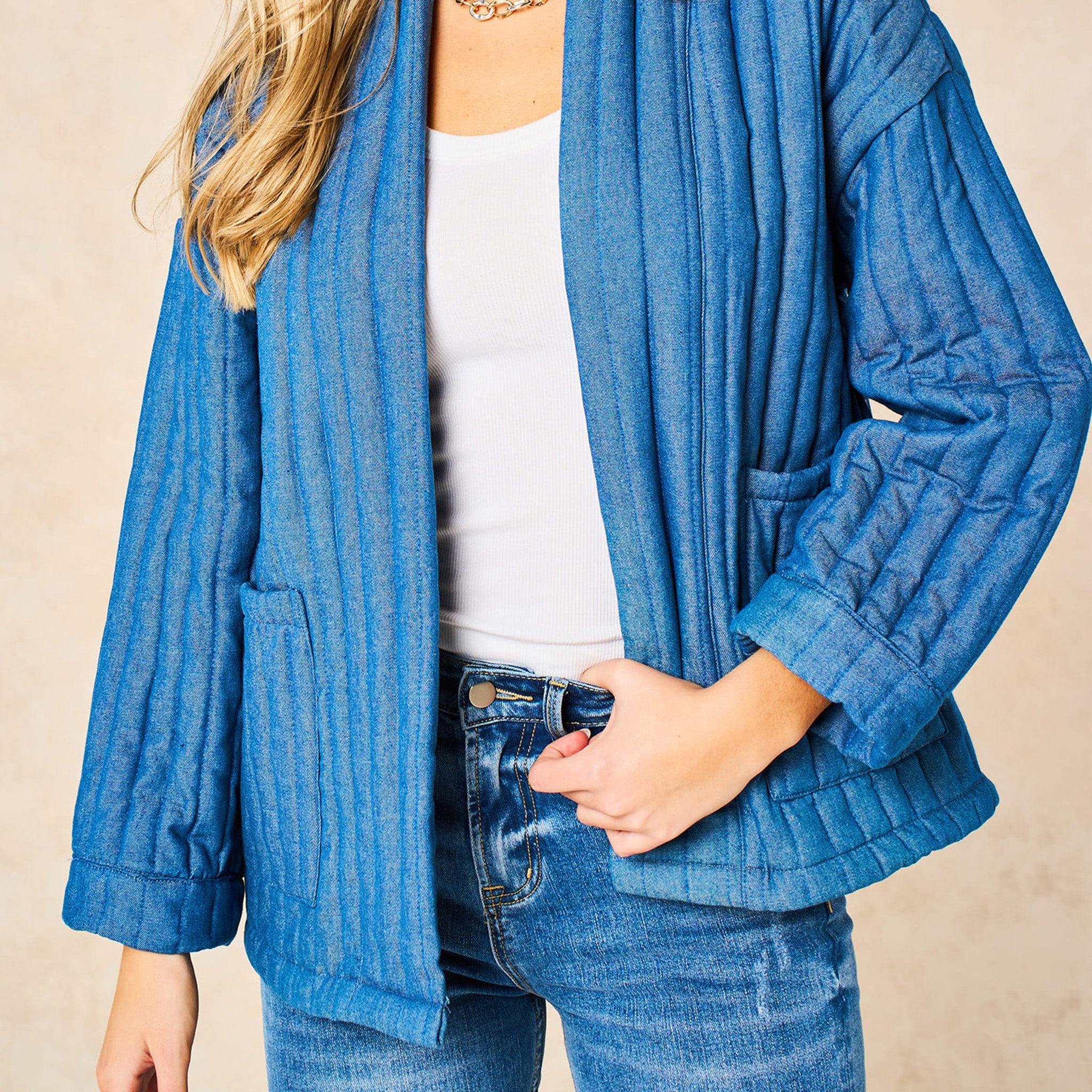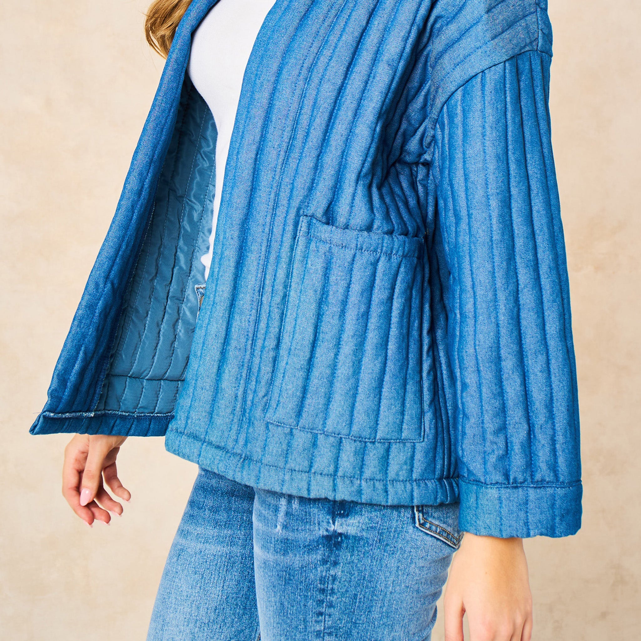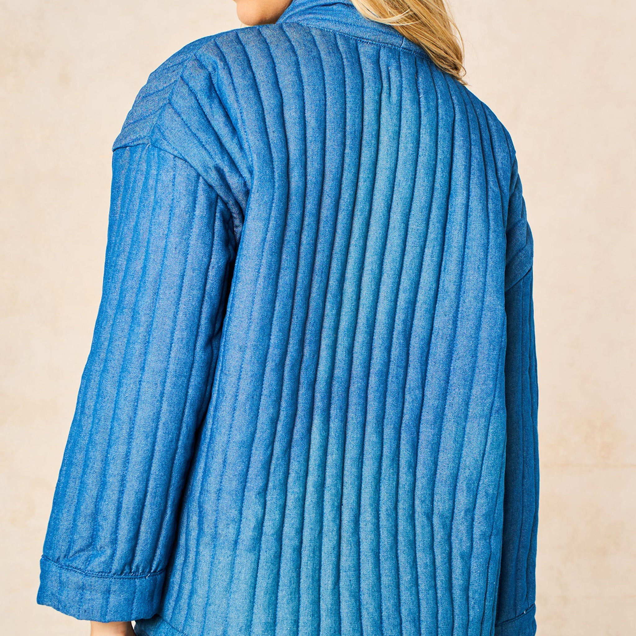 A kimono style jacket crafted quilted cotton rich chambray fabric. An open front design, this piece is ideal for seasonal layering.