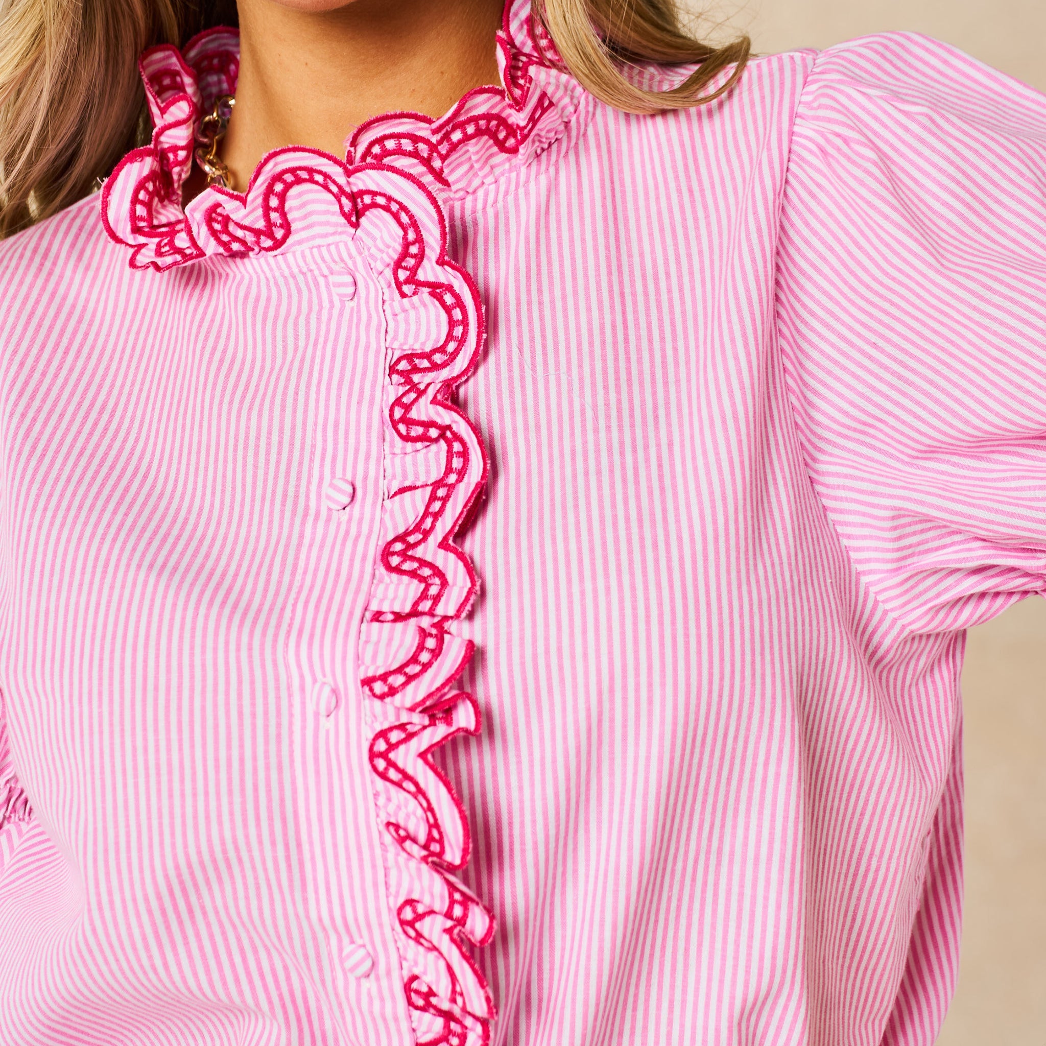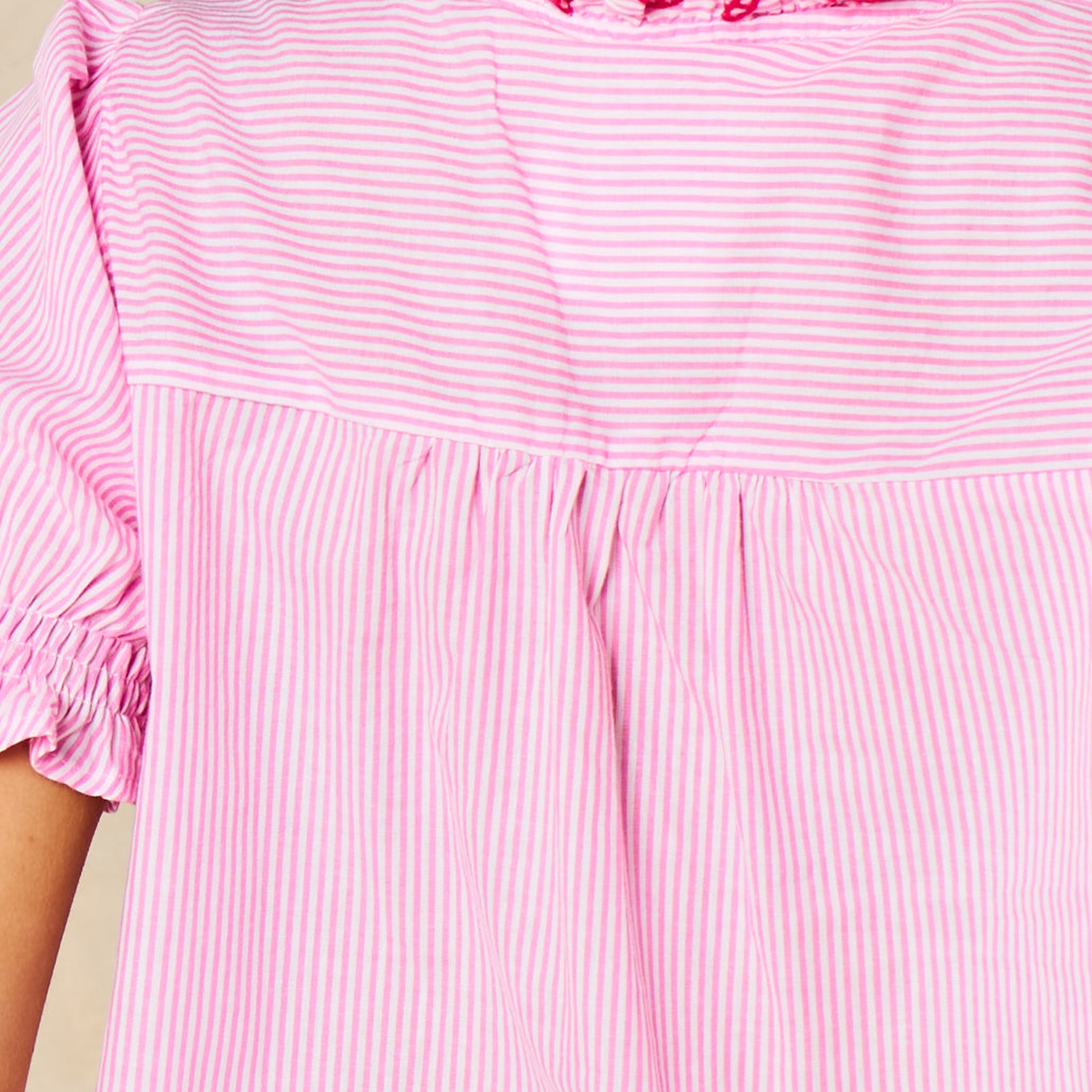 A delightful candy stripe cotton shirt featuring a fun and flirty ruffle collar and trim. This summery blouse is designed to keep you feeling cool and comfortable in warmer weather.