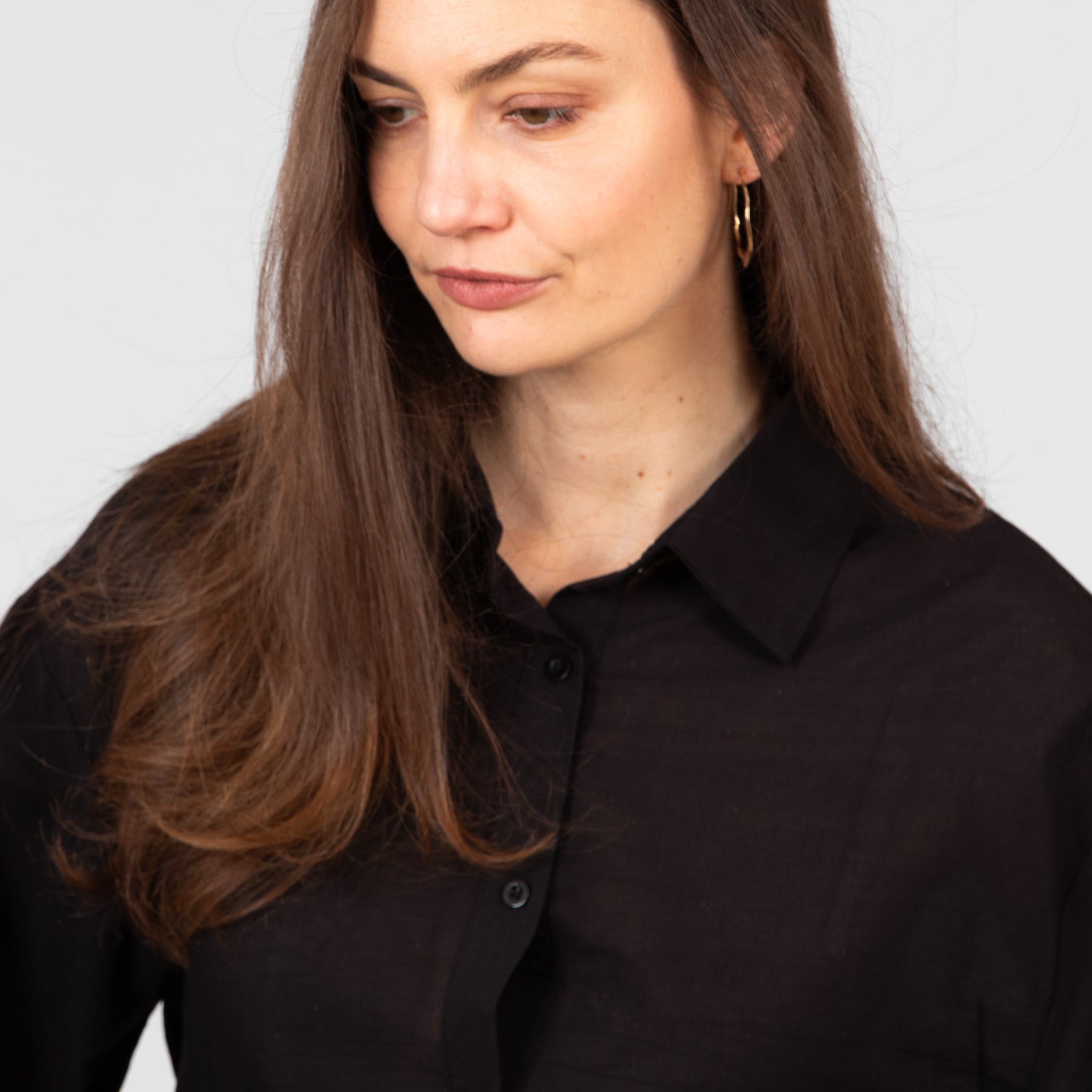 A lightweight summer shirt crafted from soft black cotton, this piece features a classic collar and long sleeves. Showcasing a delicate broderie anglaise design on the cuffs and bodice, this blouse looks chic and feminine.