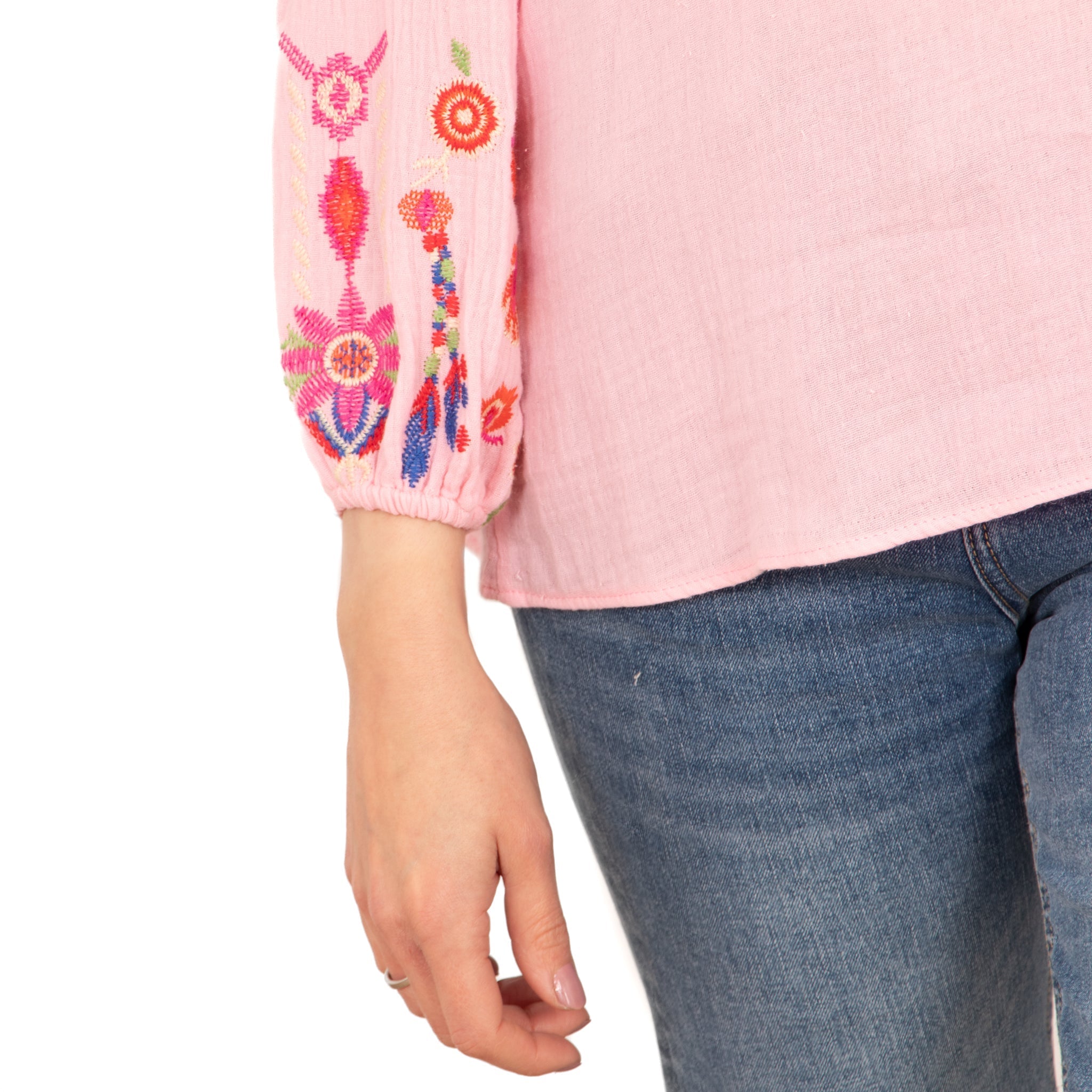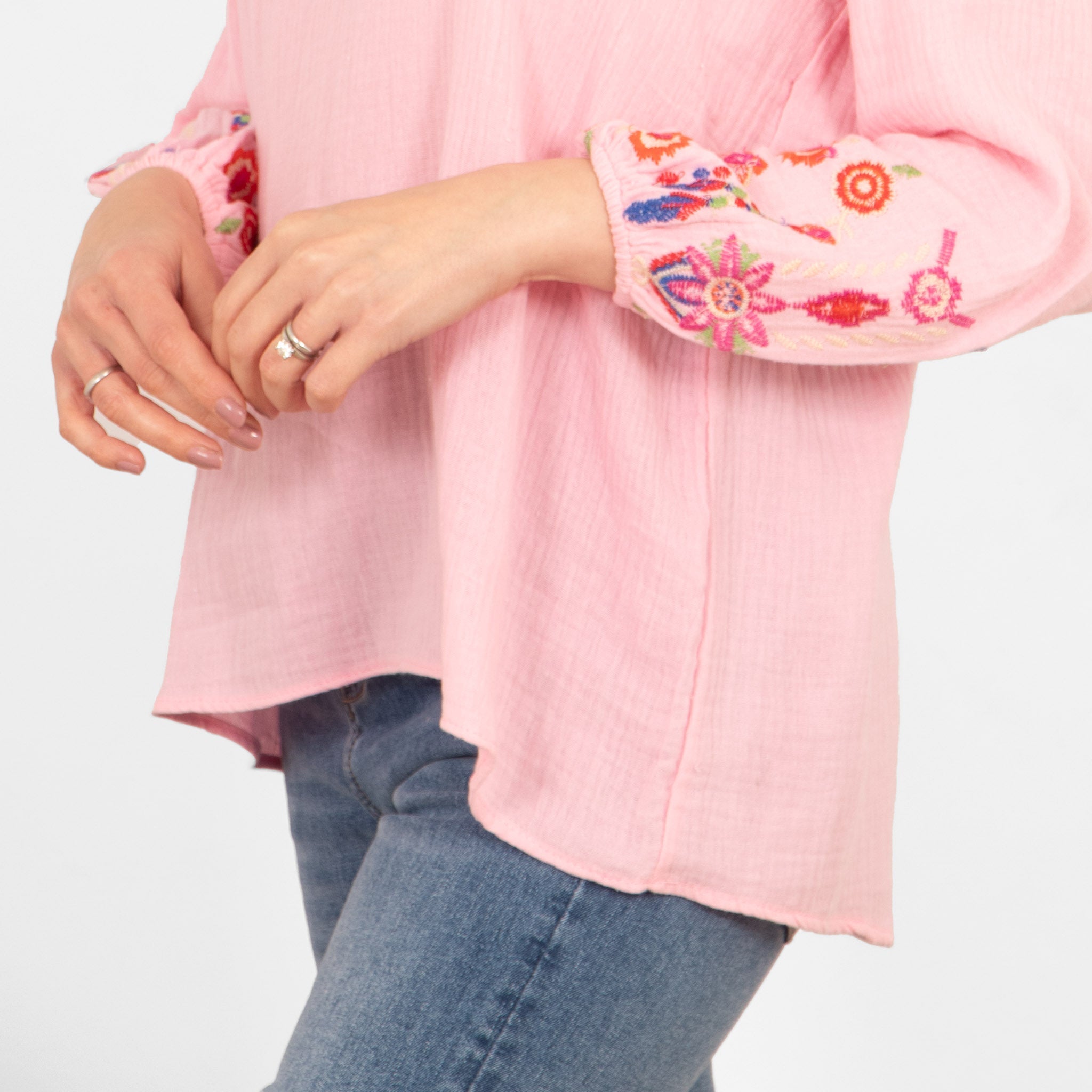 Honey Long Sleeve Cotton Blouse - Pink, Floral Embroidery