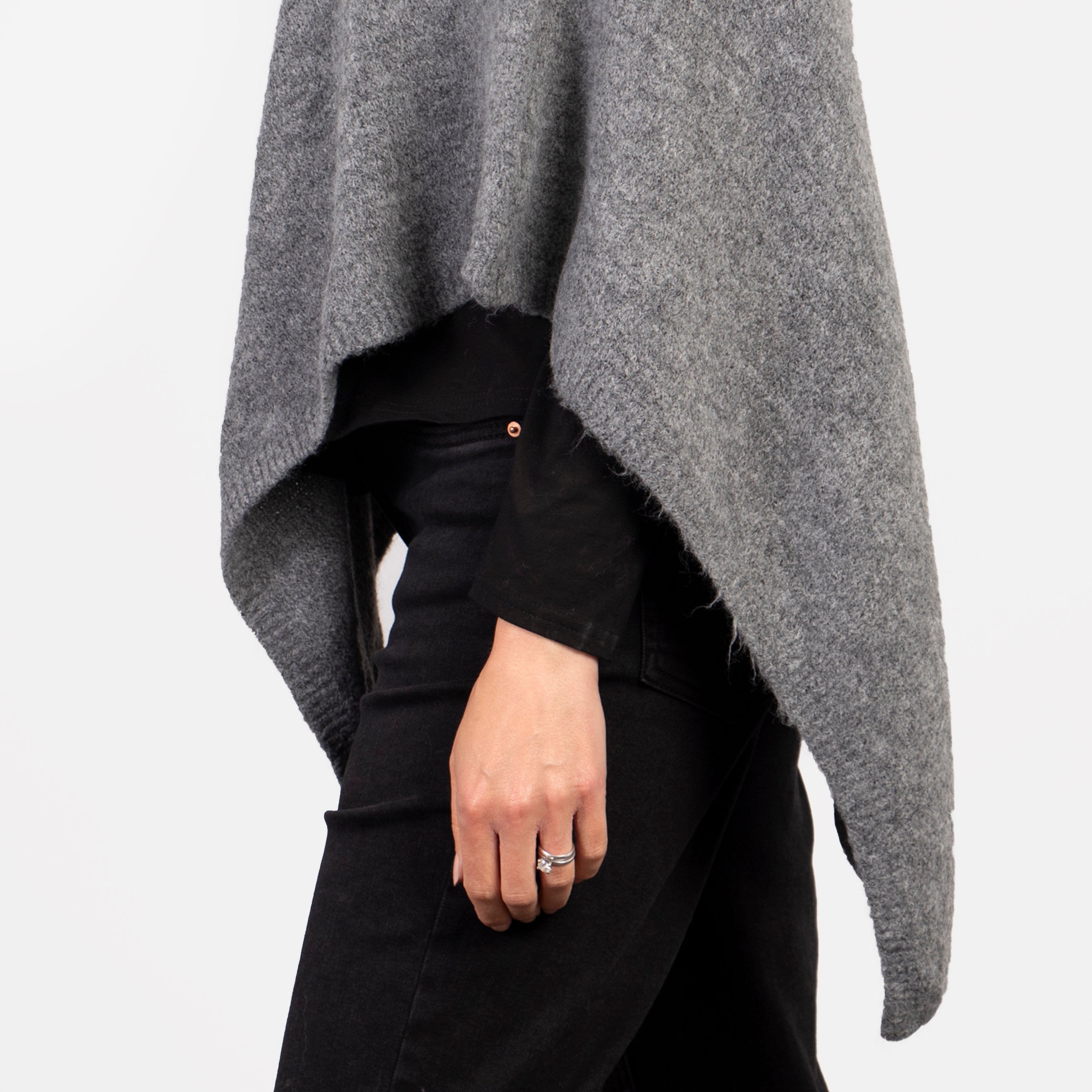 A loose fitting knitted poncho crafted from a soft wool blend yarn. Showcasing a cowl neck and flattering asymmetrical cut.
